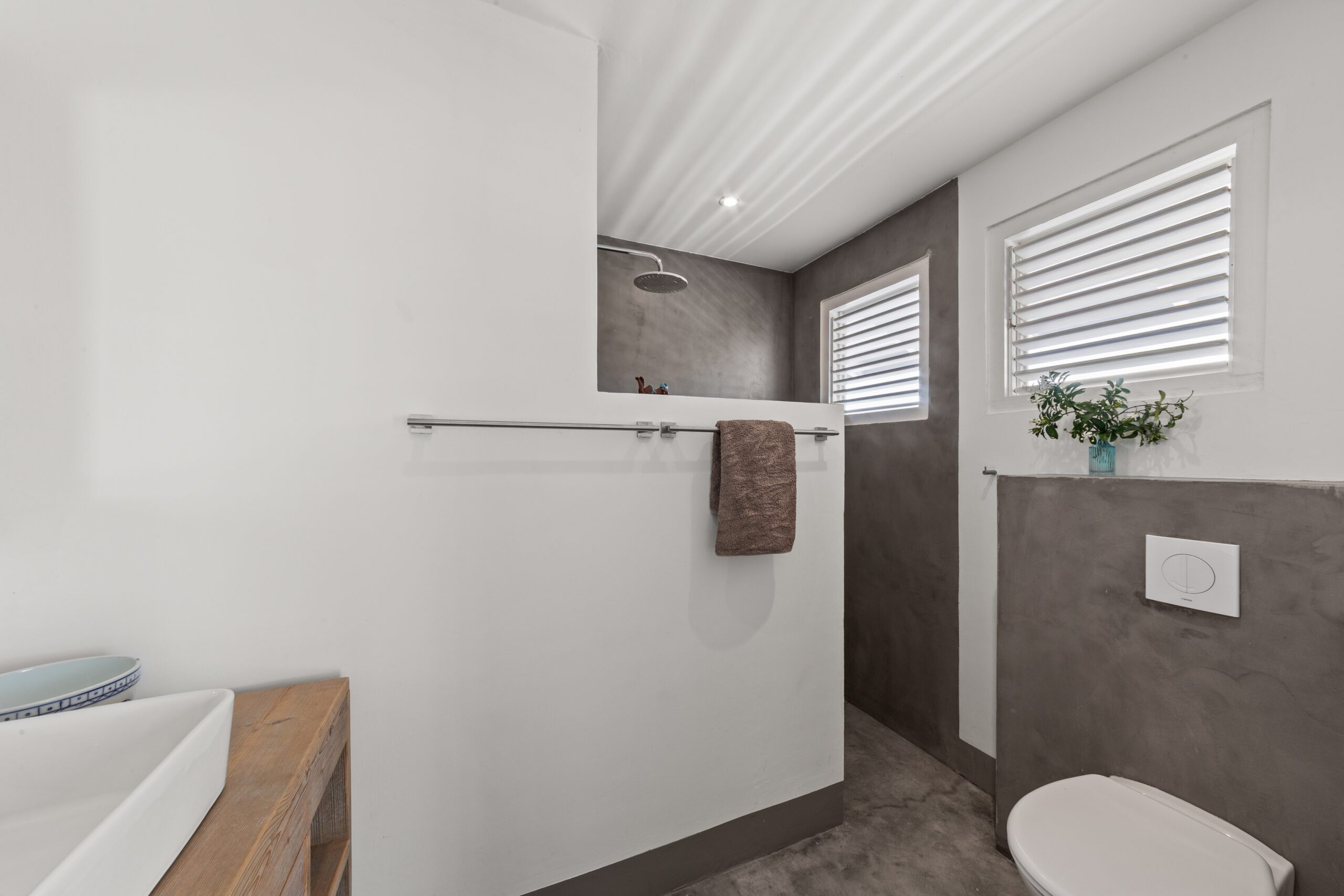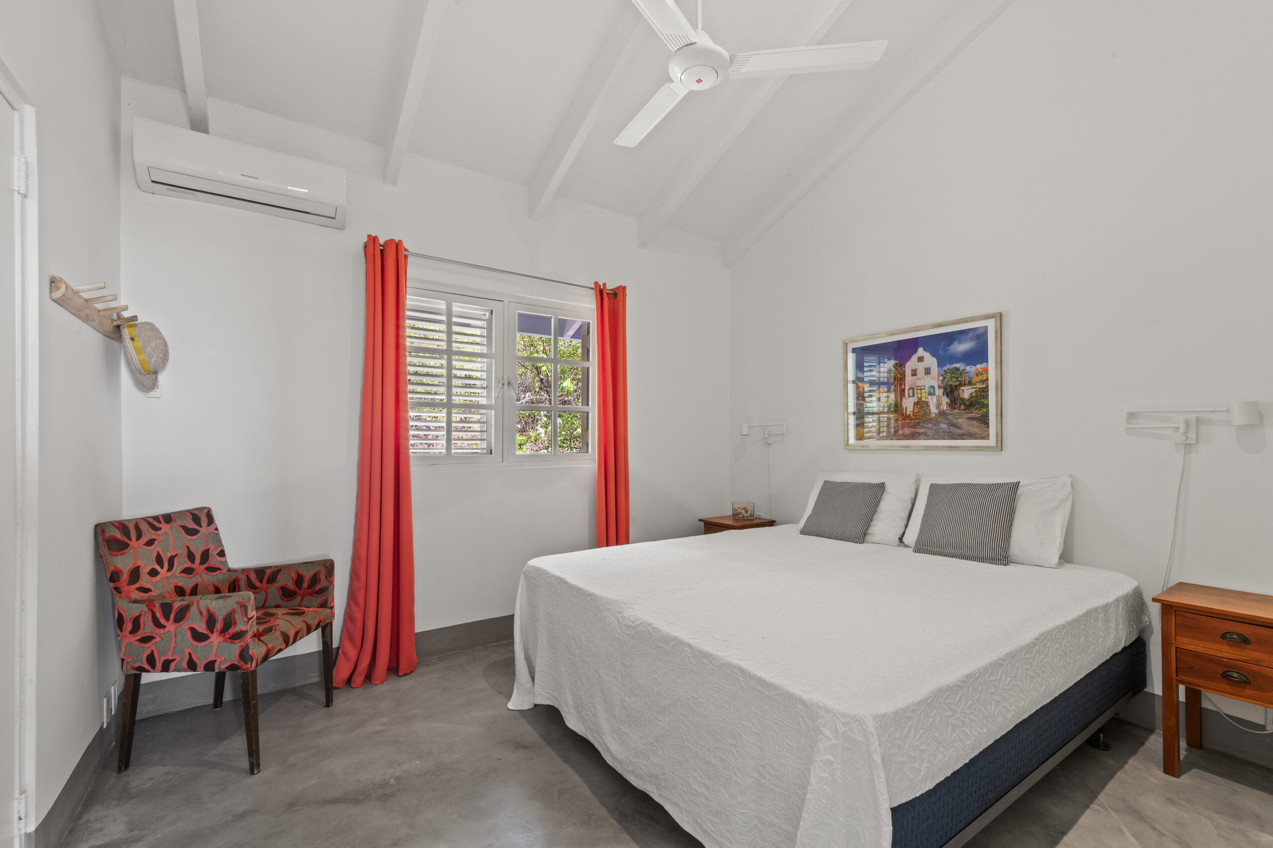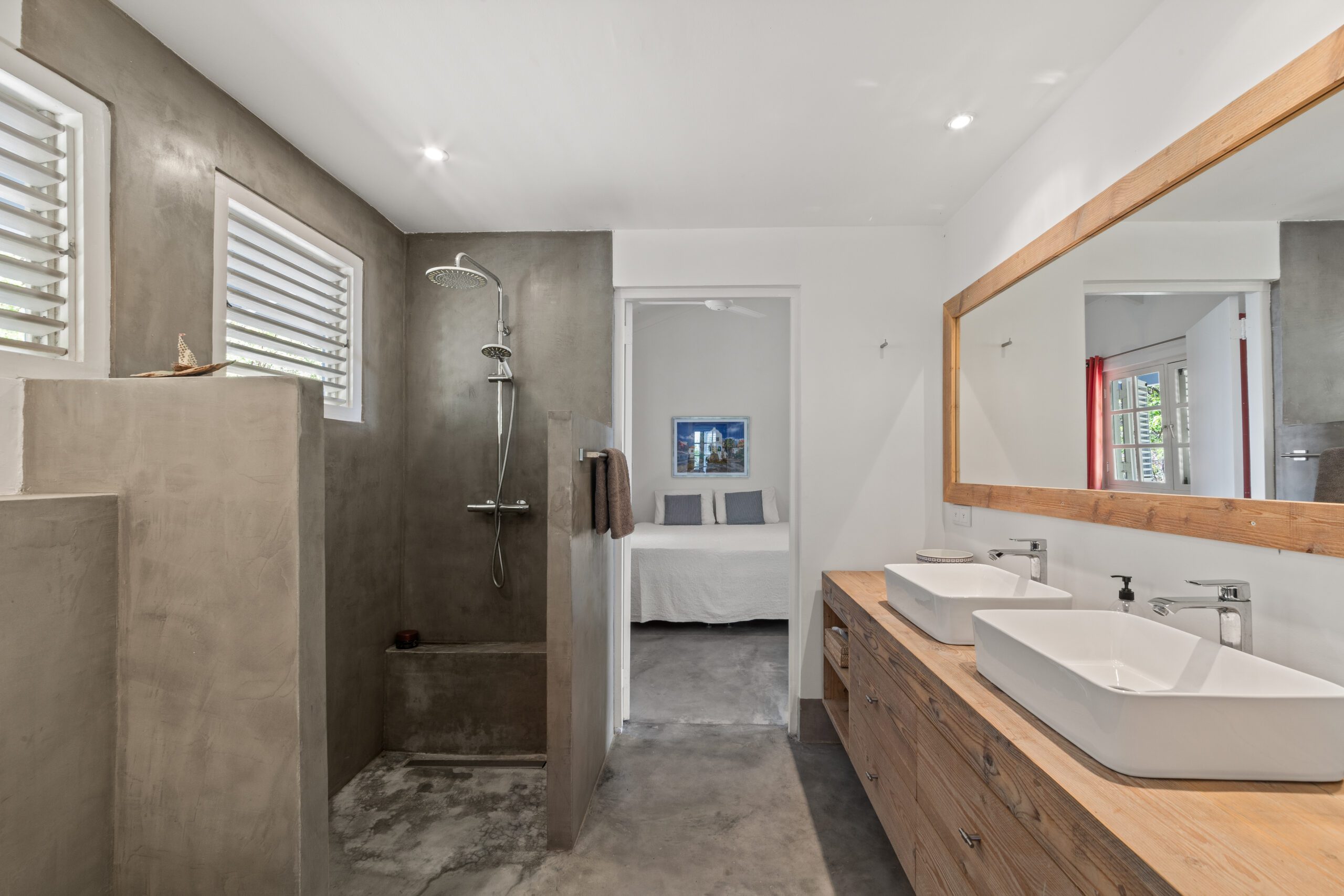 Er zijn twee comfortabele slaapkamers met airco, plafondventilatoren en verduisterende gordijnen, elk met een eigen badkamer (douche, toilet en wastafel). Daarnaast is er een apart gastentoilet.