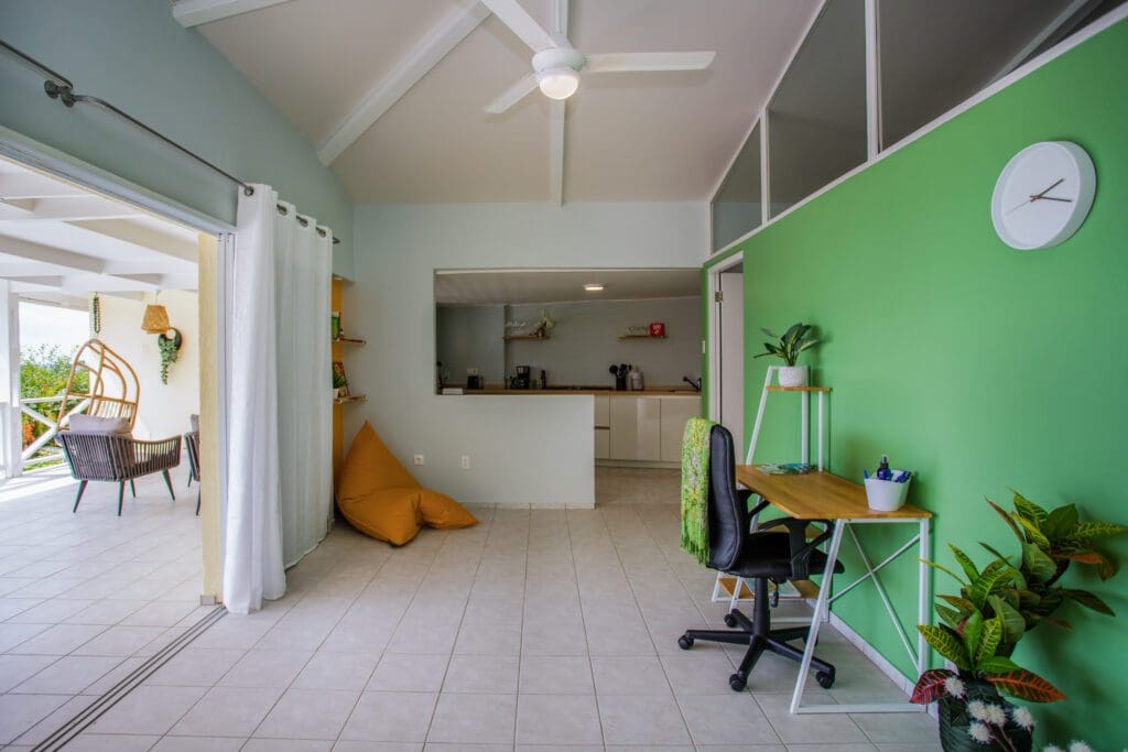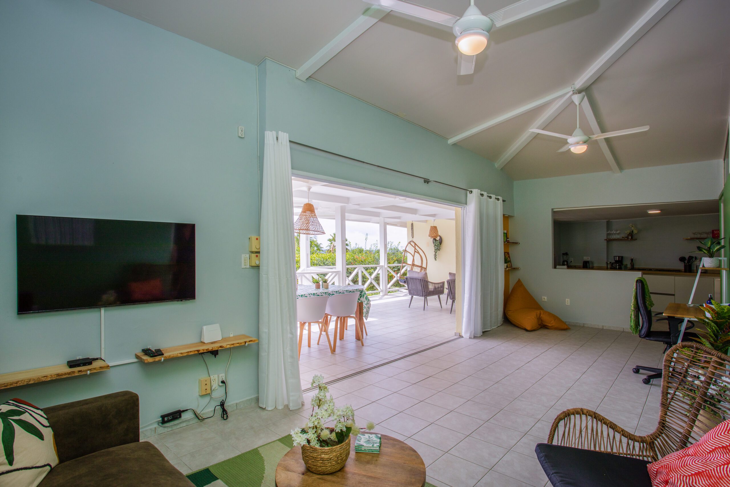 Stap binnen in onze knusse villa, een toevluchtsoord waar gezellige inrichting en luxe voorzieningen samenkomen voor een onvergetelijke ervaring. Deze betoverende woning ademt een huiselijke sfeer, waar elk detail zorgvuldig is gekozen om een warm en comfortabel thuisgevoel te creëren. Geniet van de rustige omgeving, omringd door weelderig groen, terwijl de melodieën van vrolijke vogeltjes in de tuin een natuurlijk welkom heten. Op slechts een korte loopafstand van de Caribische Zee, biedt onze knusse villa niet alleen de nabijheid van het azuurblauwe water, maar ook een adembenemend zeezicht vanaf de grote veranda.