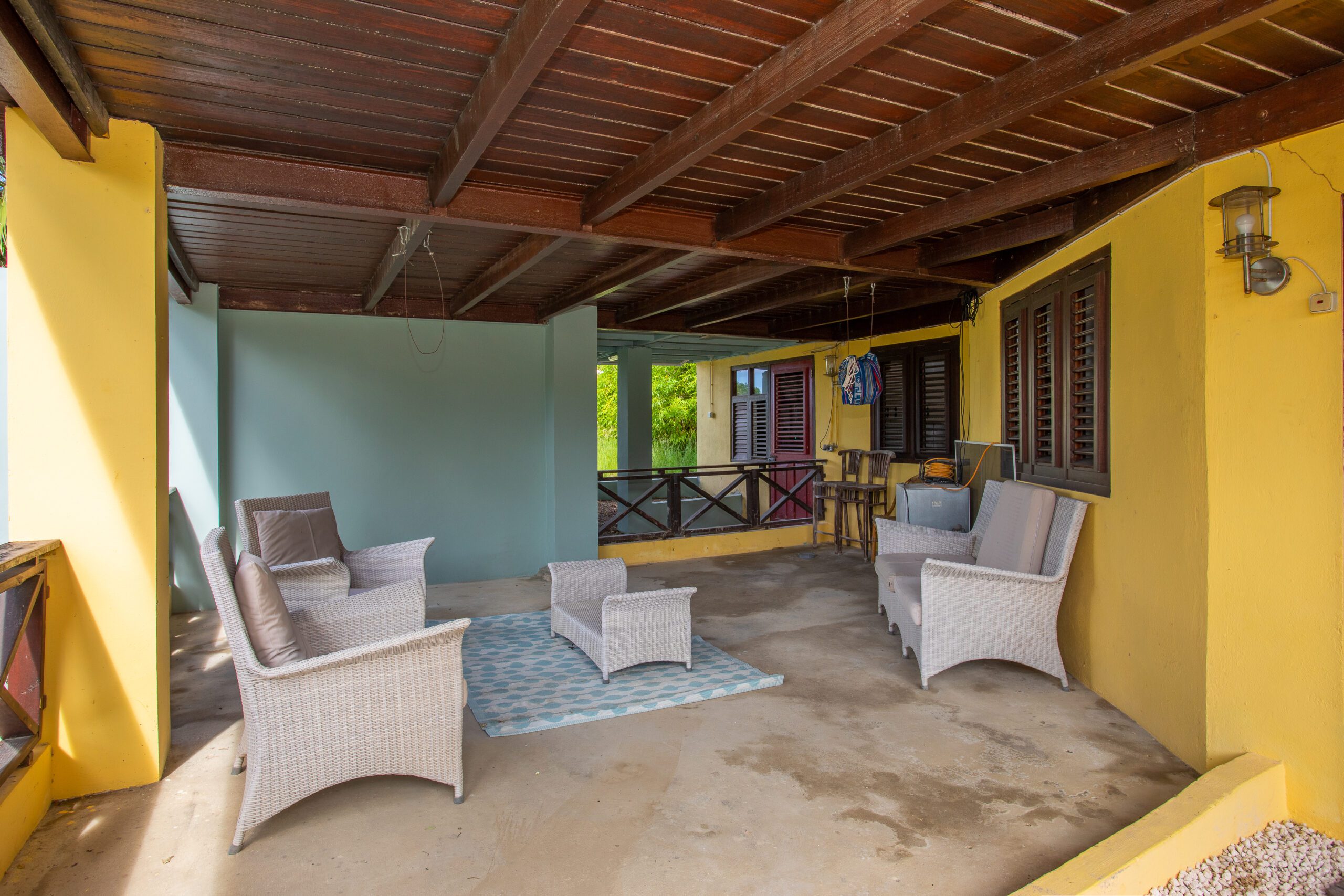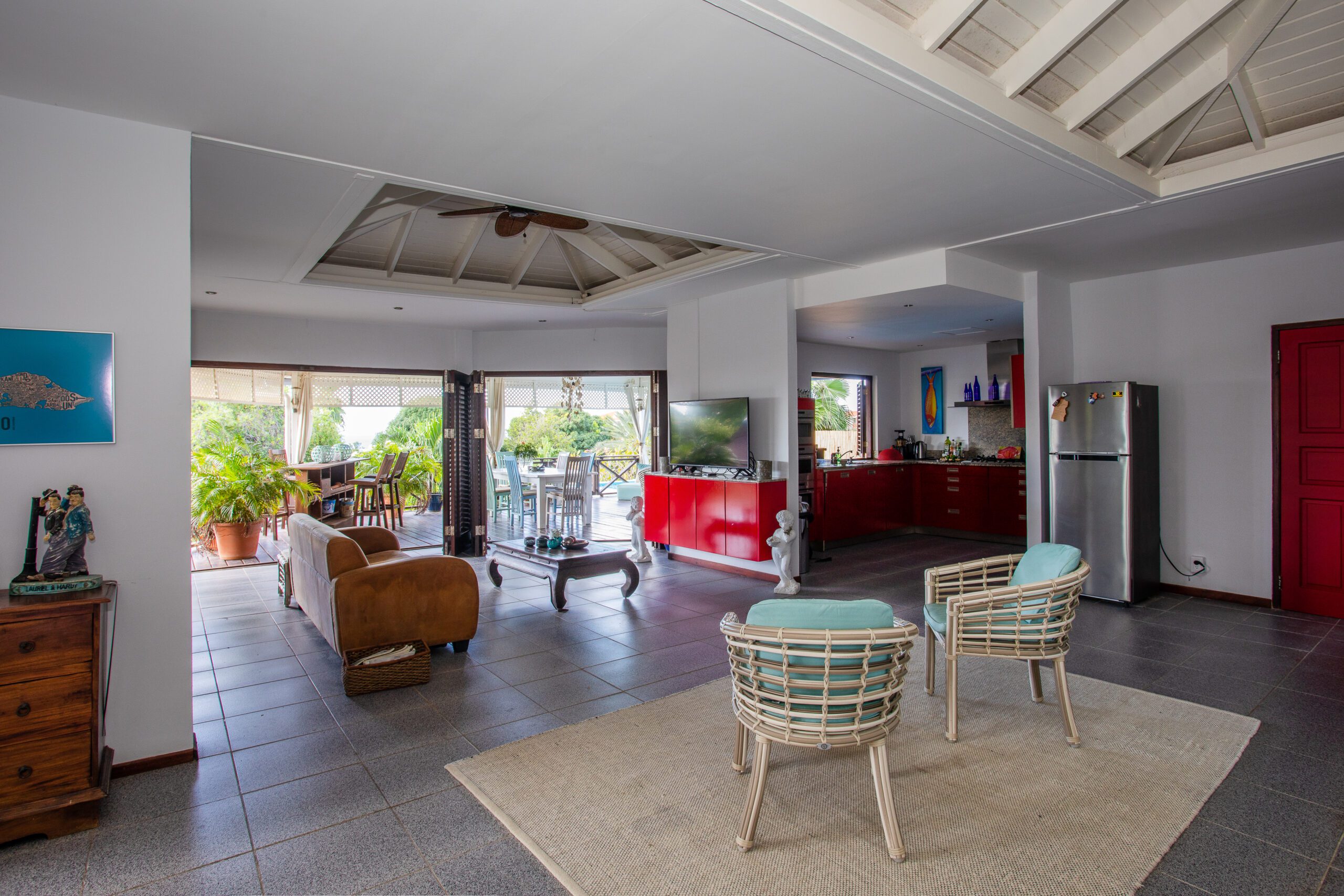 De locatie van de villa, op loopafstand van de Caribische Zee, biedt niet alleen een verbinding met de azuurblauwe wateren, maar ook een adembenemend zeezicht vanaf de grote veranda met verschillende zitjes. Laat je betoveren door het mooie privézwembad, een oase van verfrissing en ontspanning, perfect gelegen te midden van de weelderige omgeving.