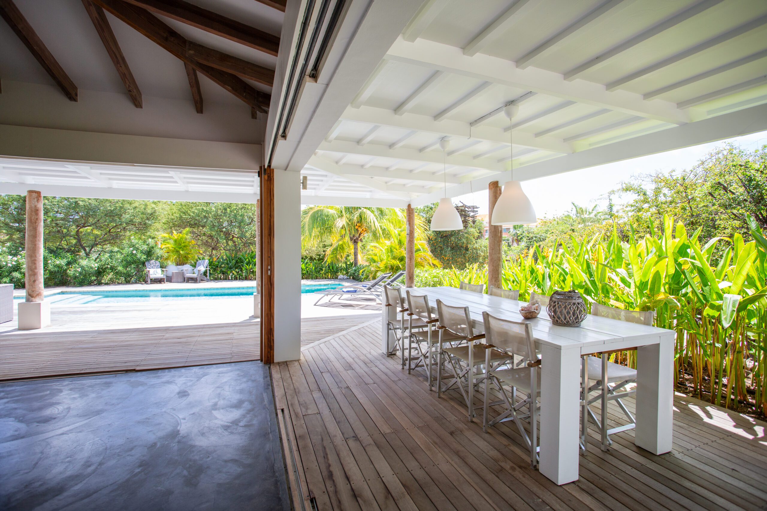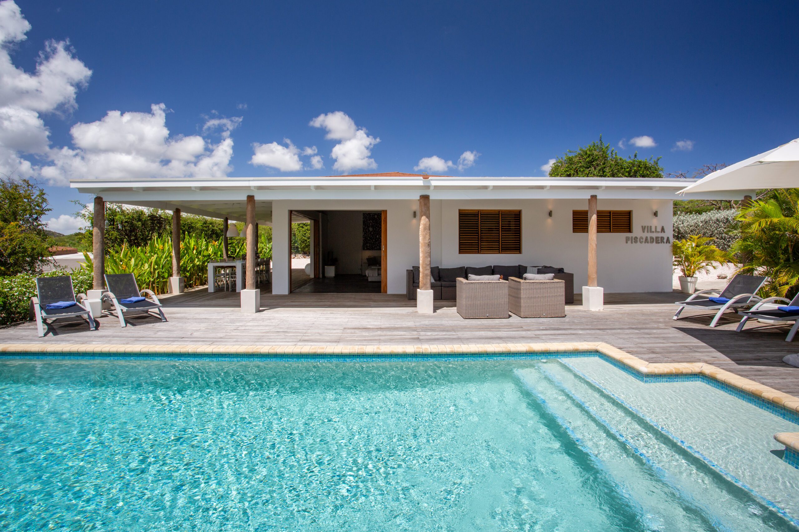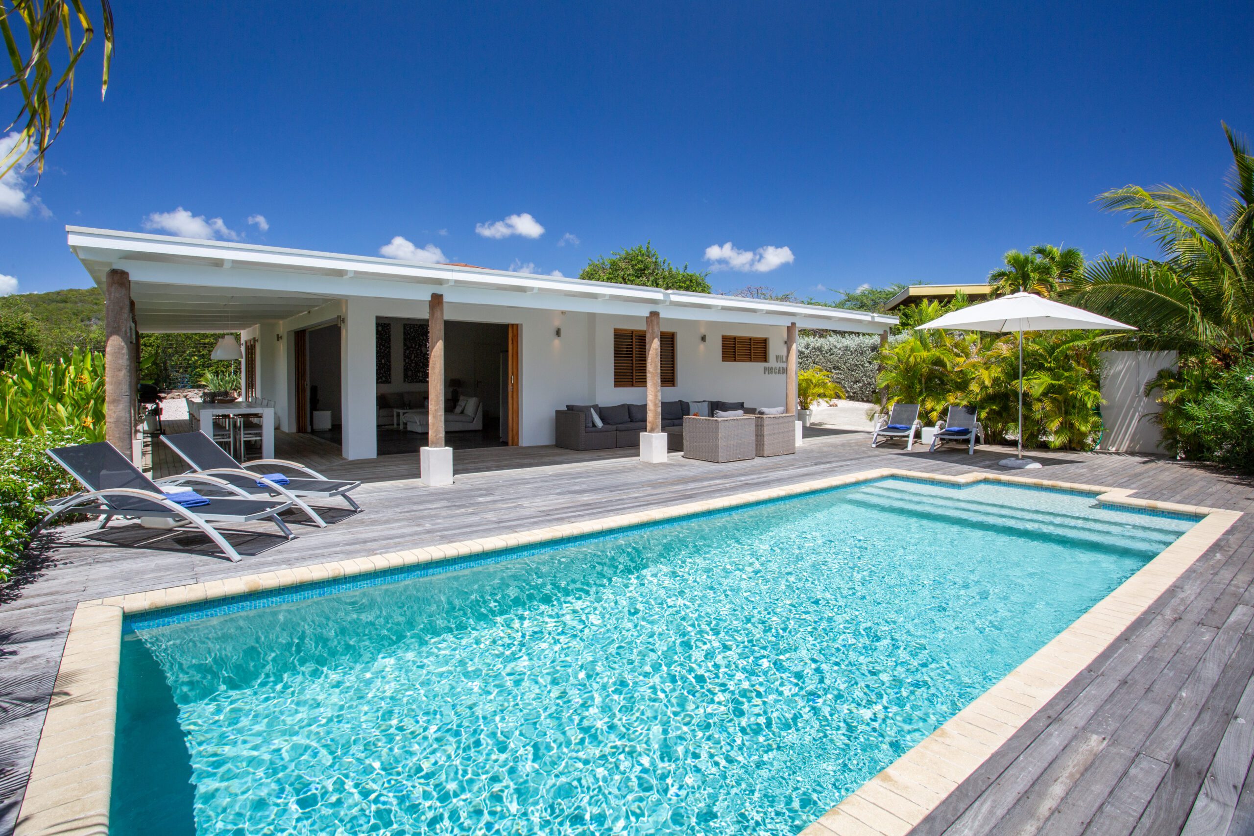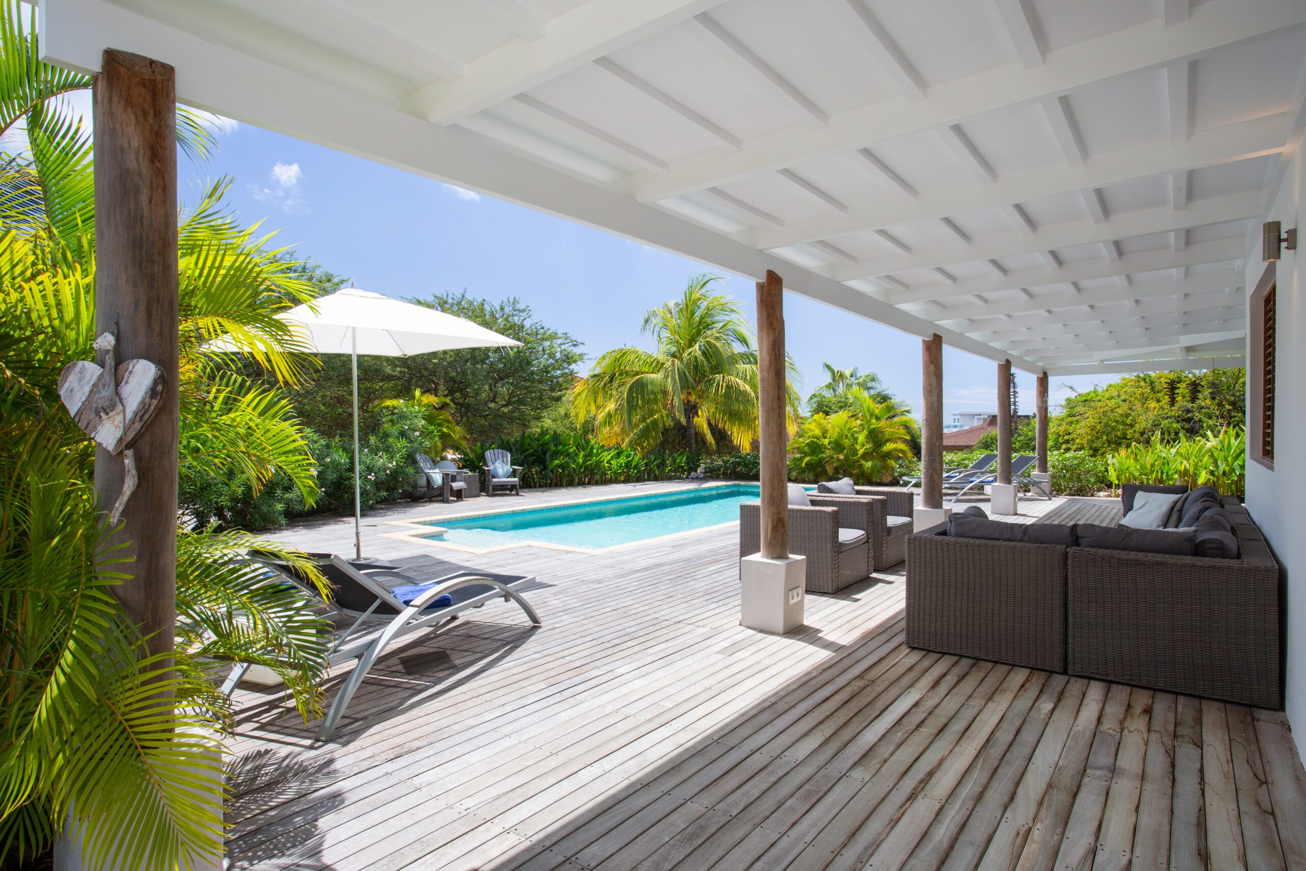 Back at the villa, unwind on our expansive veranda, perfect for lounging and soaking in the beautiful surroundings. The large pool, surrounded by a stunning pool deck, offers an oasis of refreshment and relaxation for those perfect holiday moments. Whether you opt for a day at the beach or an exploration of the historic streets of Willemstad, our villa provides a level of luxury and comfort that elevates your vacation to new heights.