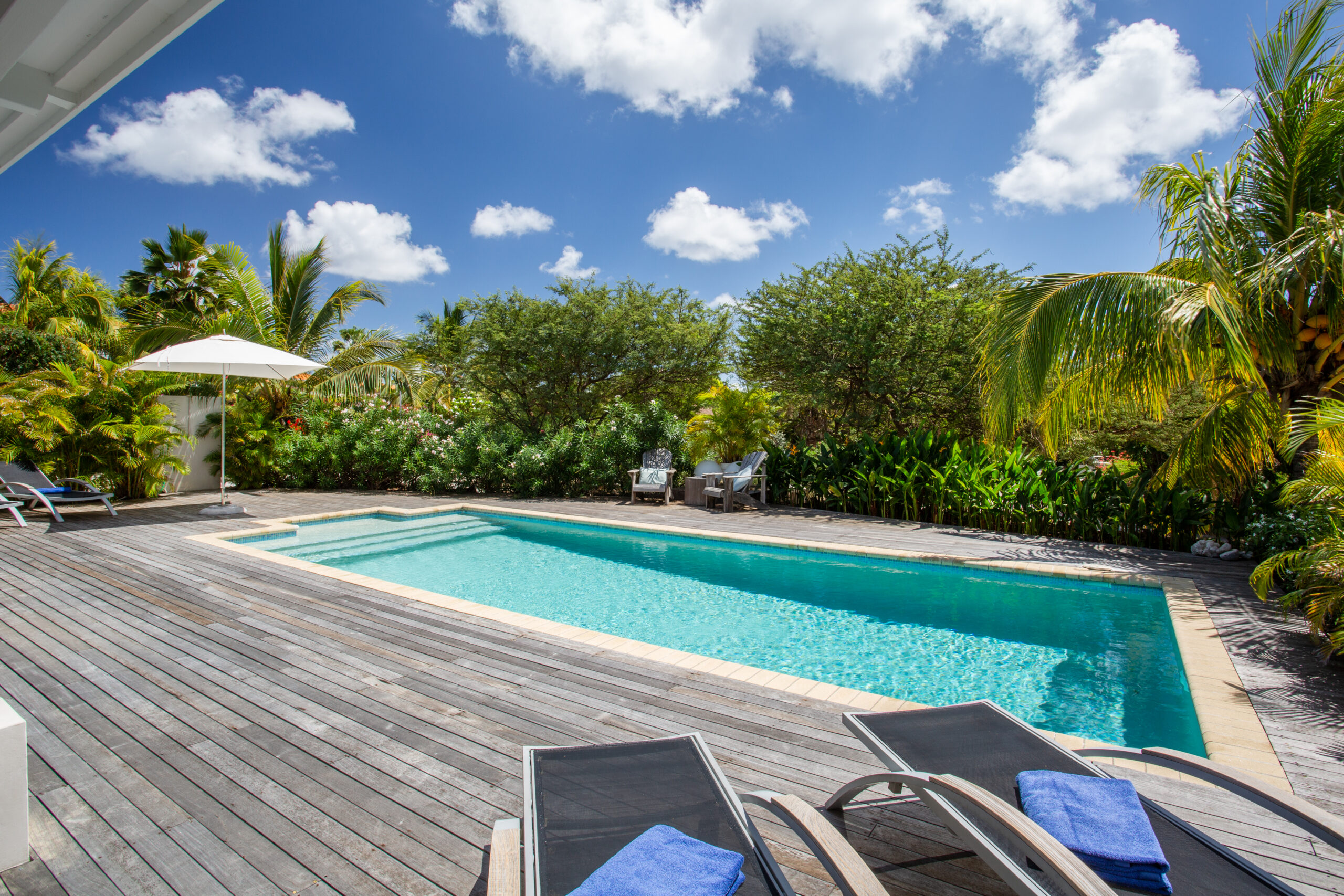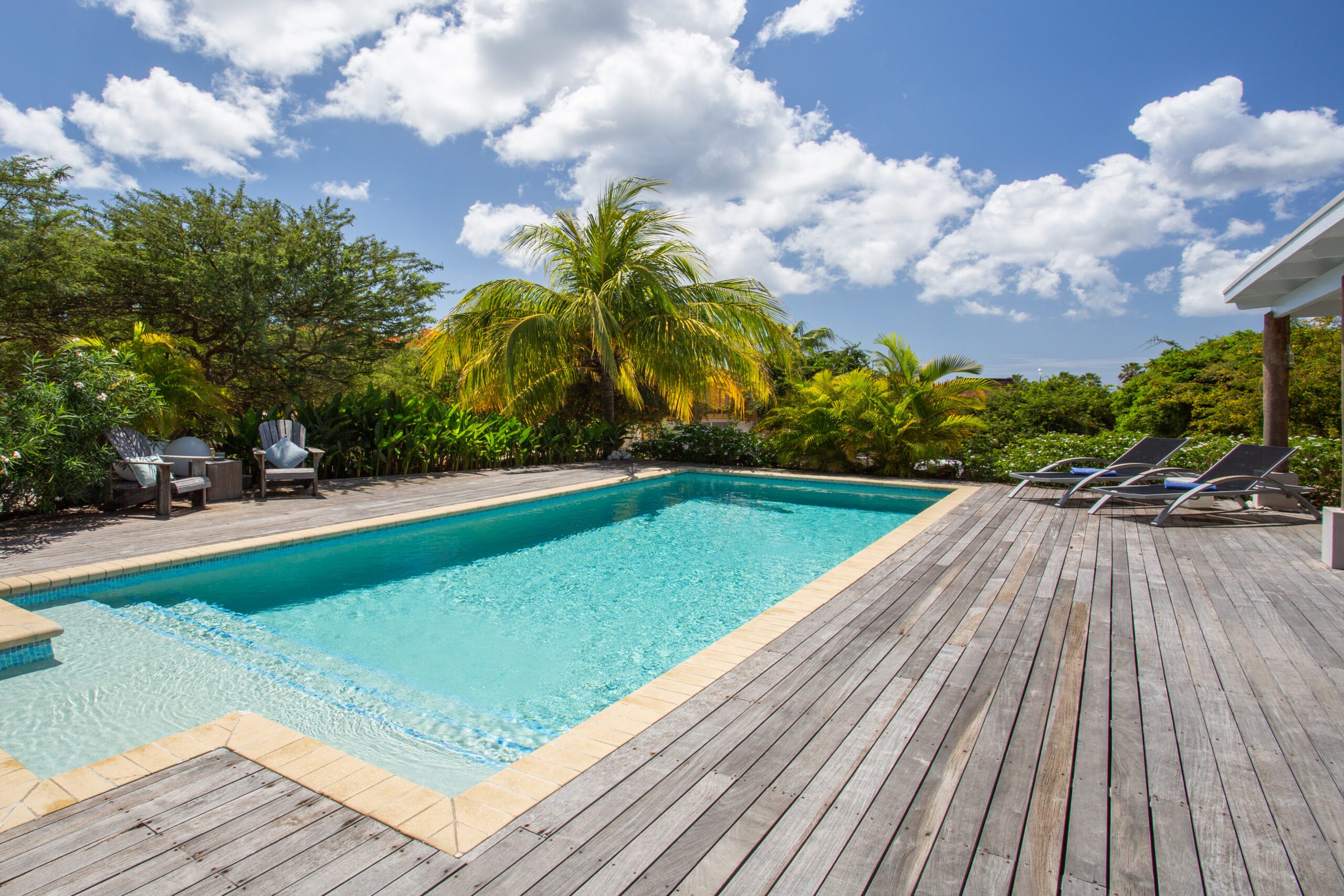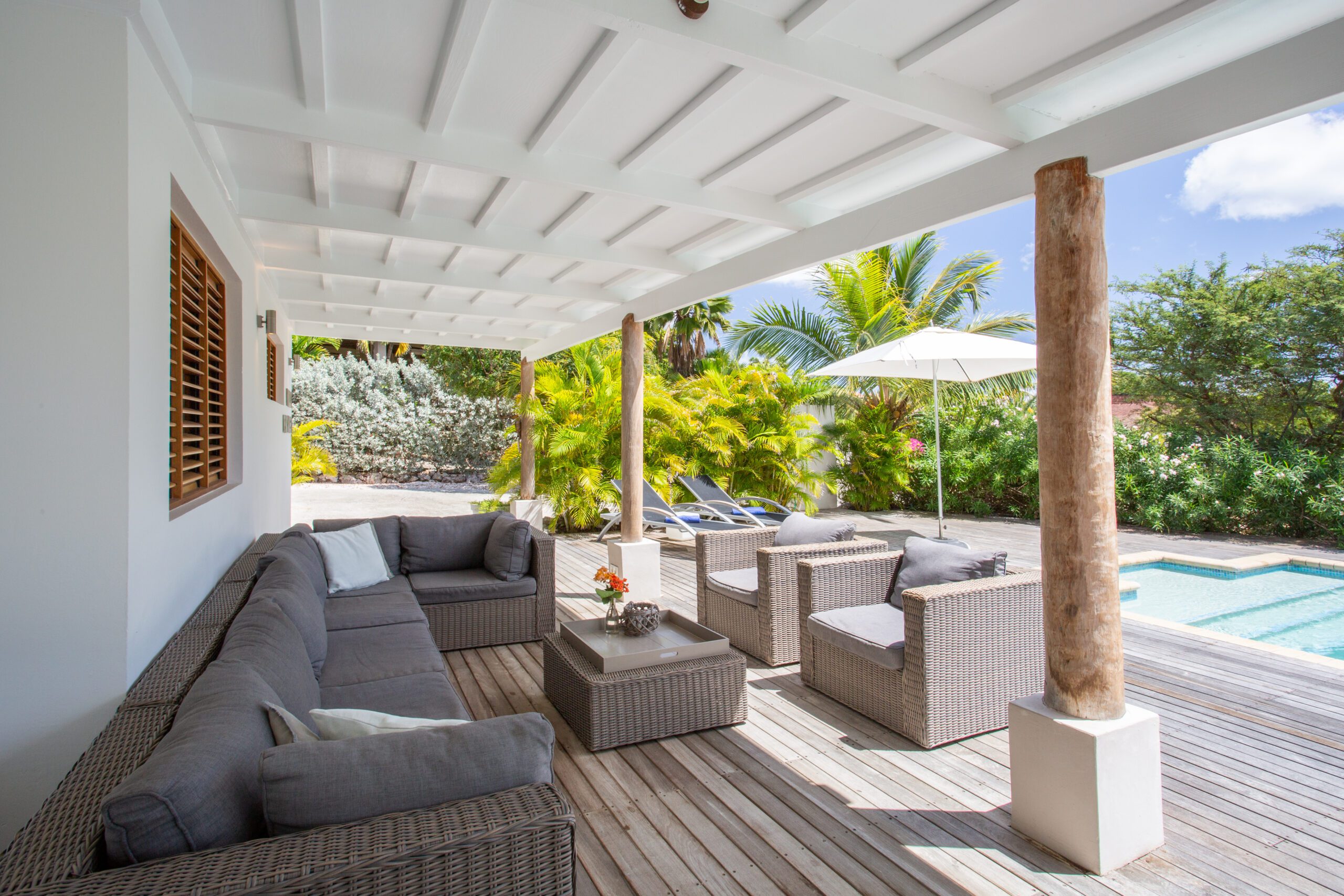 Back at the villa, unwind on our expansive veranda, perfect for lounging and soaking in the beautiful surroundings. The large pool, surrounded by a stunning pool deck, offers an oasis of refreshment and relaxation for those perfect holiday moments. Whether you opt for a day at the beach or an exploration of the historic streets of Willemstad, our villa provides a level of luxury and comfort that elevates your vacation to new heights.